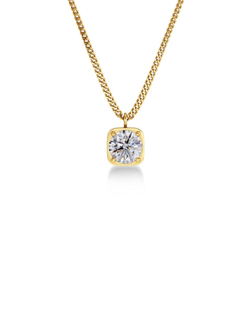 Sassy Gemma delivers rebellious glamour, with round stones set in a square pattern. In this elegant necklace, the glittering stone from the chain hangs attached to its slightly rounded square, seen here in 14K gold plating. Great to match with the beautiful studs and hoops, fine necklaces or expressive ring from the same line.