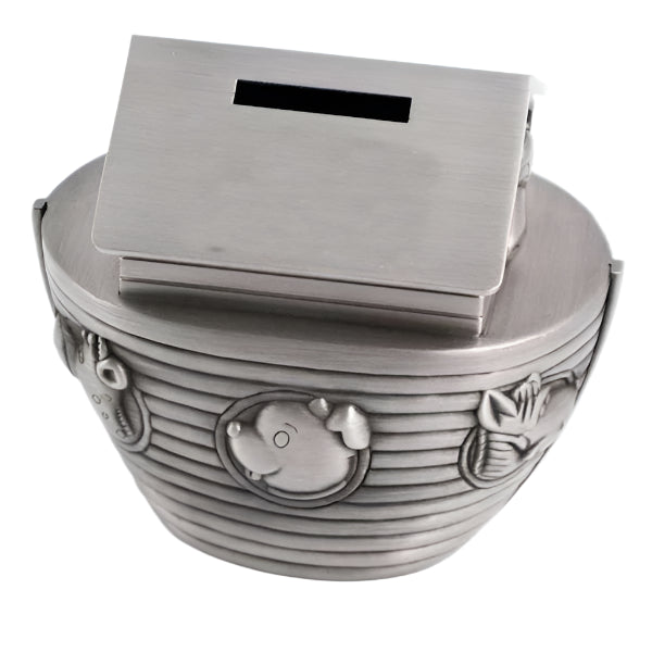 Want to give the gift that keeps on giving. This pewter "Noah's Ark" money bank fits the bill. The piggy bank is approximately 4.5" x 3" x 4" . The top of the bank can be engraved to personalize this gift for that special little person on your list.