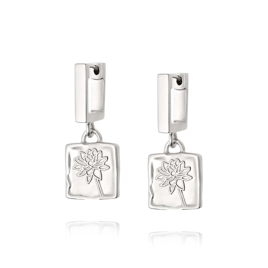 Find your inner peace and good fortune with the Water Lily Drop Earrings. This floral symbol is imprinted on a square, tactile pendant and hung on a unique, square huggie hoop. Your new everyday essential, because who can say no to a touch of good fortune.