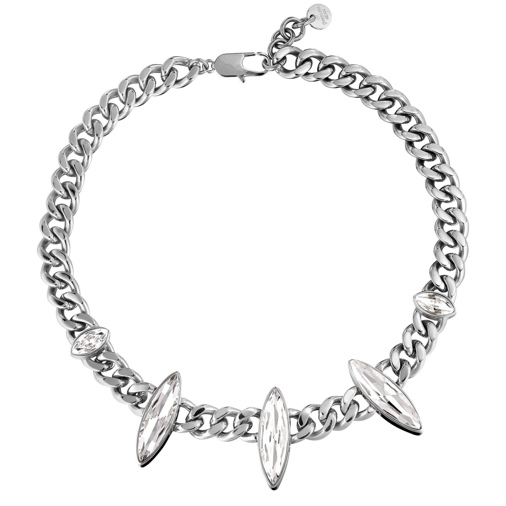 OPSICA - is a chunky short necklace that lies beautifully in the neckline. Super attention-grabbing and at the same time super chic chic! The silver toned chain is designed in polished steel, and the five large and small navette-shaped crystals in clear.