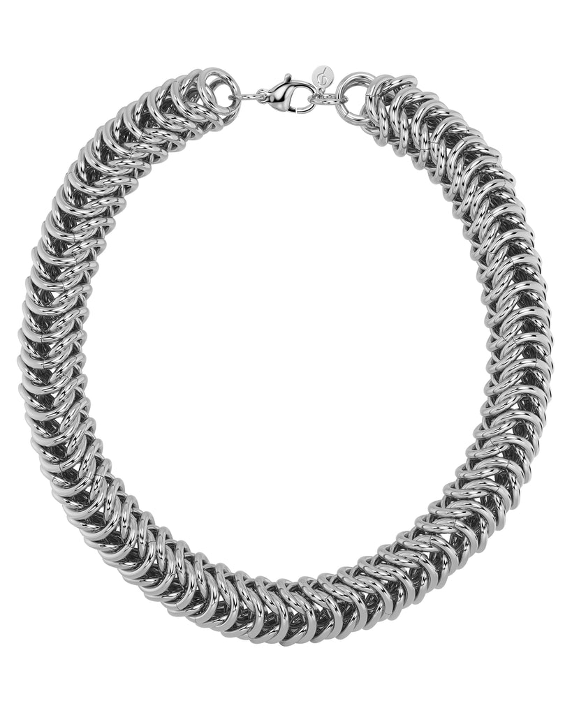 Palazzo's oversized necklace snakes around the neck in a dramatic fashion. Seen here in shiny stainless steel.