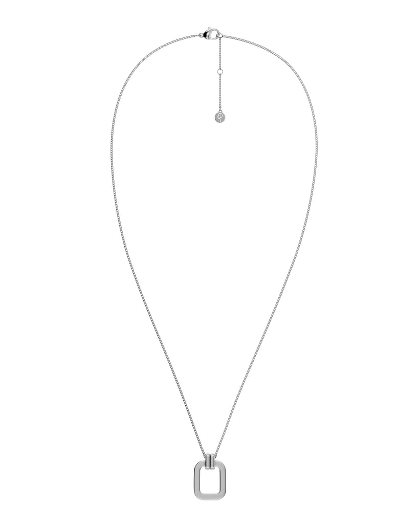 The everyday series Plaza is based on a softly shaped square. Seen here in a long necklace in shiny stainless steel that rests attractively around the neck.