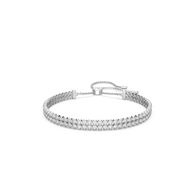 This timeless rhodium-plated bracelet is an ideal gift for lovers of sparkle. Two delicate strands of clear stones are set in a new cupchain design. Draping beautifully on the wrist, the bracelet is finished with an innovative new sliding ball closure, which ensures the customer can easily adjust the size for the perfect fit. Pretty and understated, it’s also a bold statement of elegance. Wear with a Swarovski watch for daytime sparkle, or dial up the glamour for a night out by layering with contrasting styles.