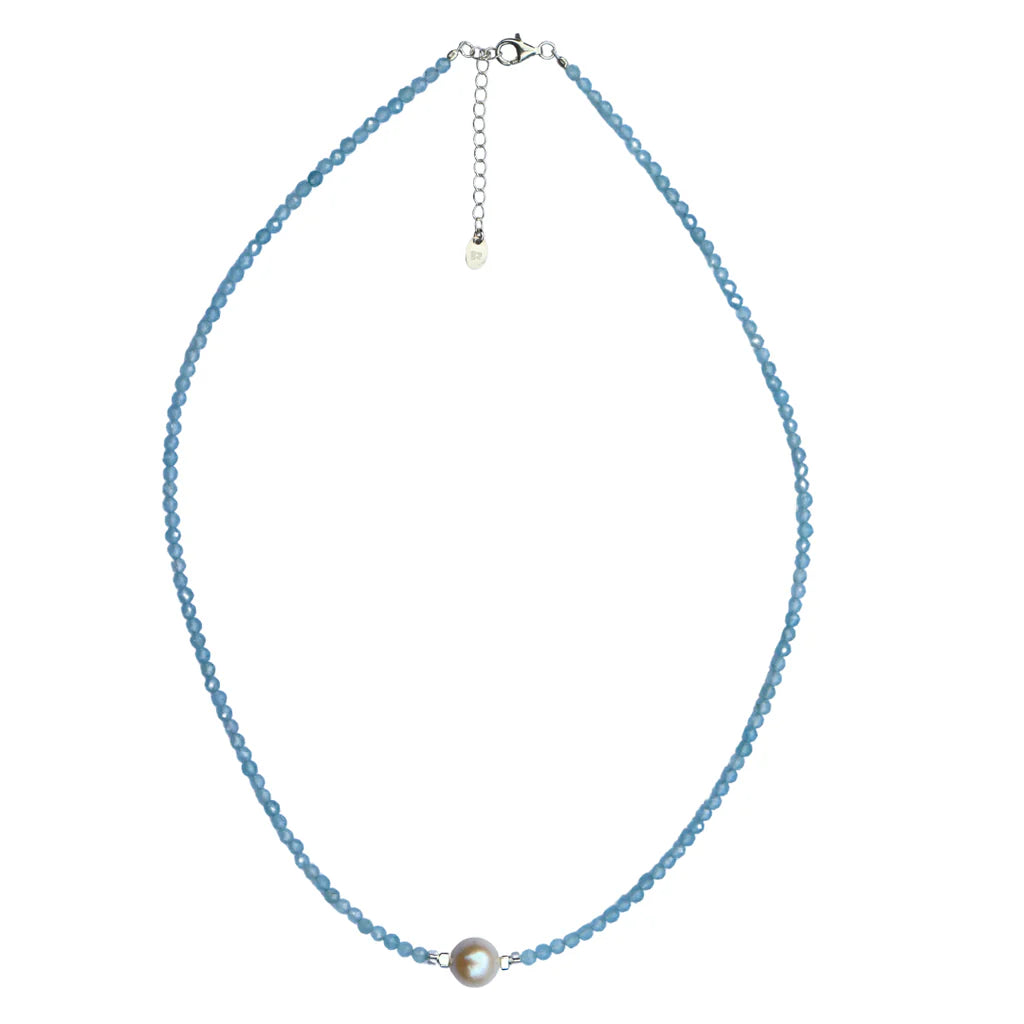 This elegant necklace showcases the stunning, semi-precious aquamarine stones, beautifully complemented by a freshwater pearl centrepiece. Measuring 45cm, its short length makes it ideal for wearing alone or layering with your favourite pieces.