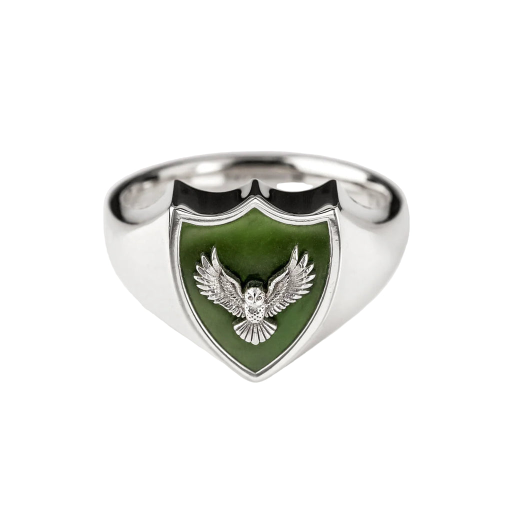 Owls are symbols of luck, prosperity and wisdom. Available in three popular sizes, this shield shaped signet ring features an Owl set into the Pounamu and set in sterling silver.