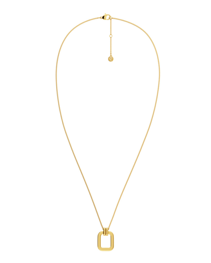 The everyday series Plaza is based on a softly shaped square. Seen here in a long necklace with 14K gold plating that rests attractively around the neck.