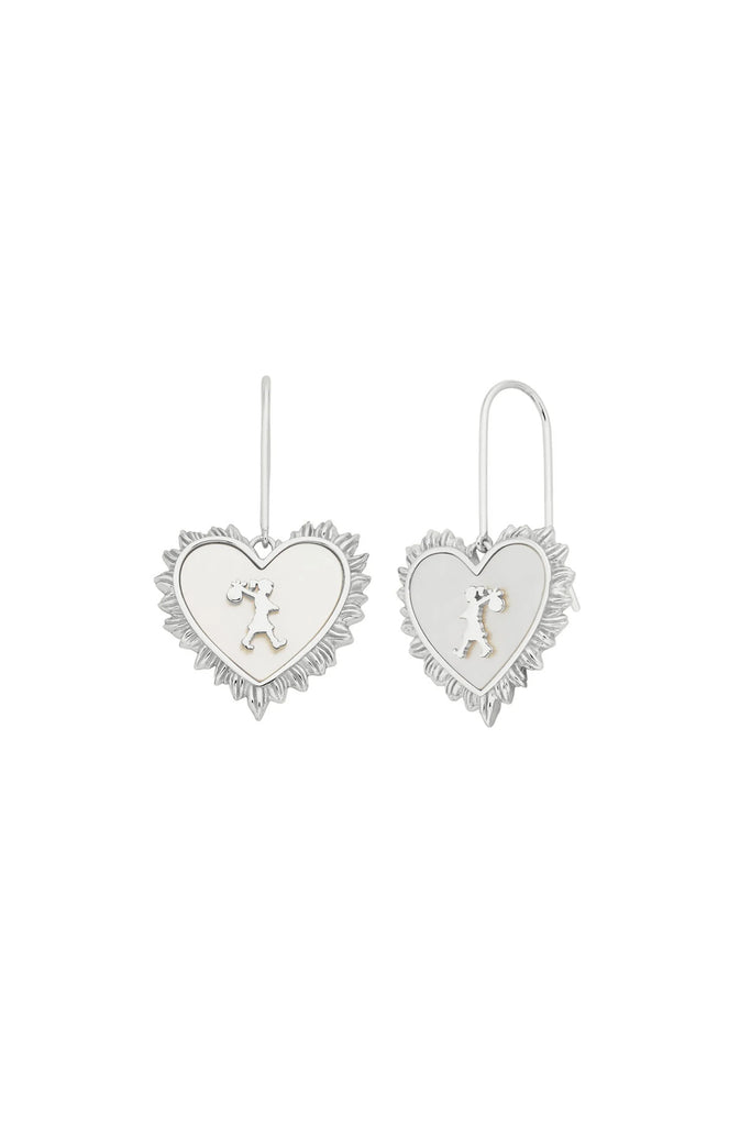 The iconic Runaway Girl rests atop a heart of mother-of-pearl, framed in intricate flames. These statement earrings blend whimsy with grandeur, echoing Rococo’s ornate charm. This version is crafted in sterling silver.
