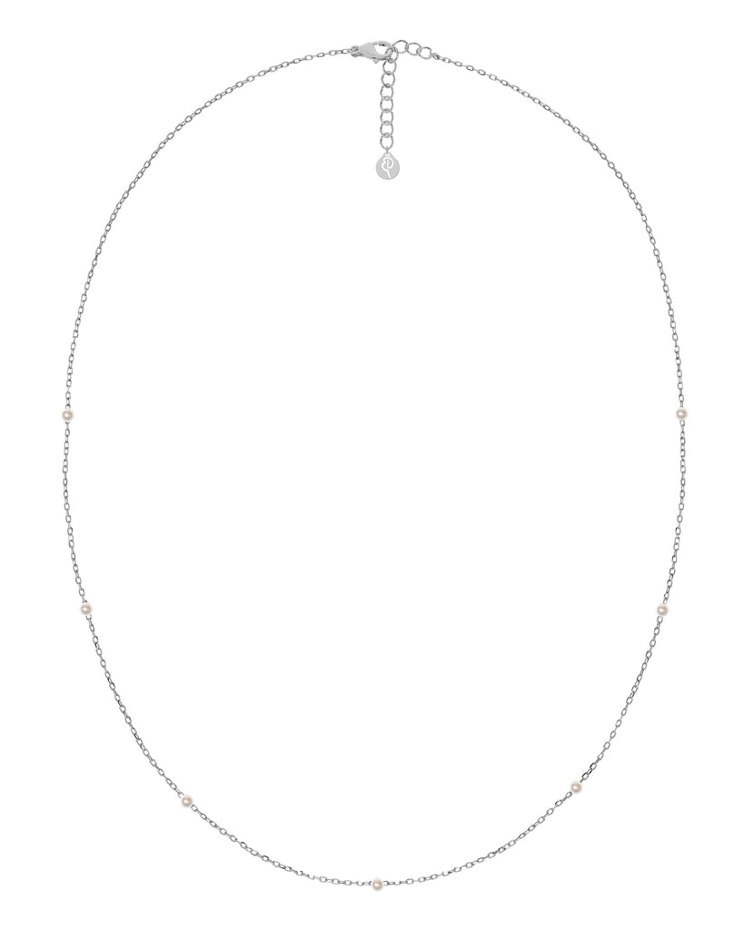 Mini pearls are the essence of Lilo. Seen here in a dainty necklace in shiny stainless steel that sits beautifully against the collarbone.