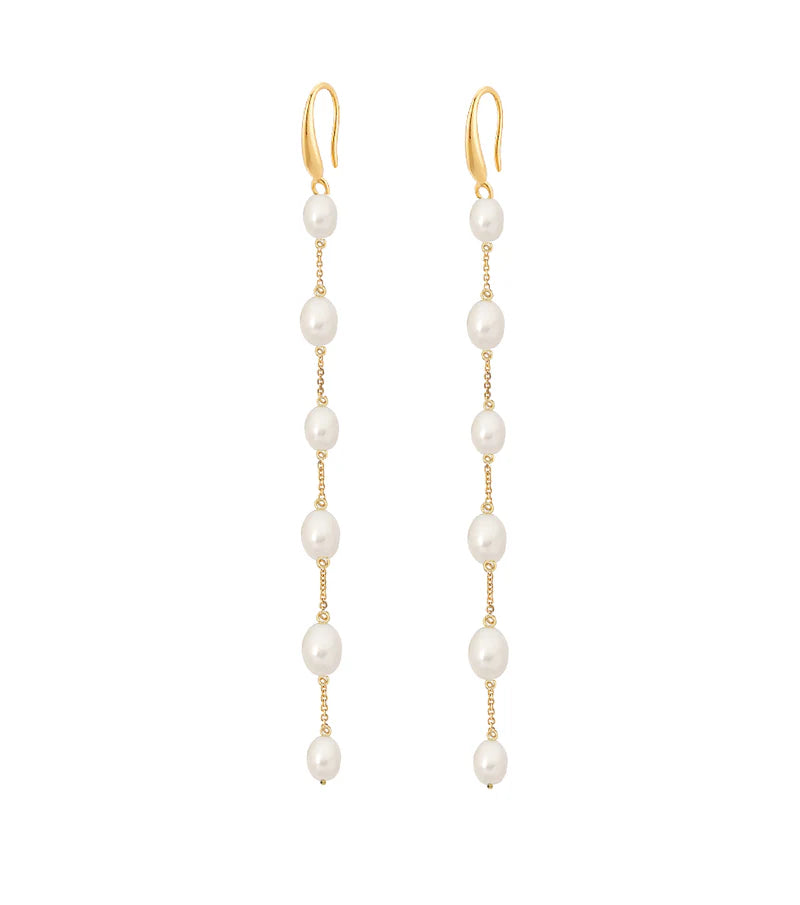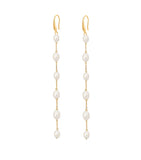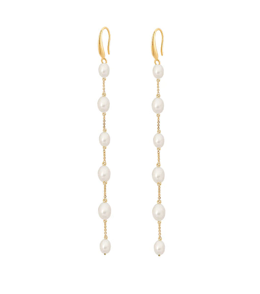 Pacific features freshwater pearls and chains in a stylish combination. A pair of real shoulder dusters can be seen here – ideal for parties and festive occasions. For a complete park look, pair with the necklace and bracelet. Seen in shiny 14K gold plating, Pacific Long Earrings have a nicely bevelled hook.